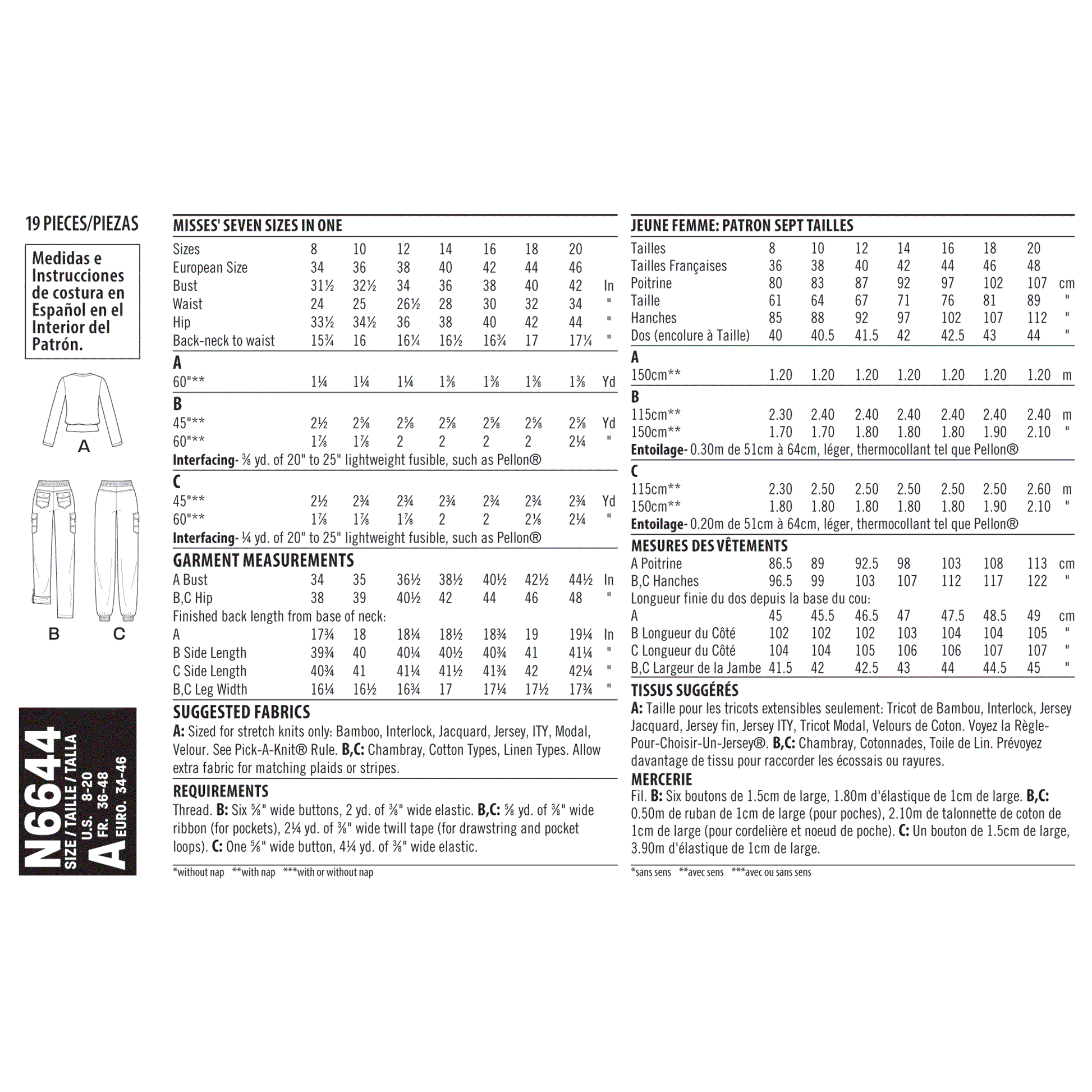 Ladies casual top and pull-on pants. Pull-on v-neck top with long sleeves and waistband, designed for stretch knits only. Pants, designed for woven fabrics, have elasticated waist, cuffed or turn-up tabbed hems. Side-seam and cargo pockets. New Look Pattern.