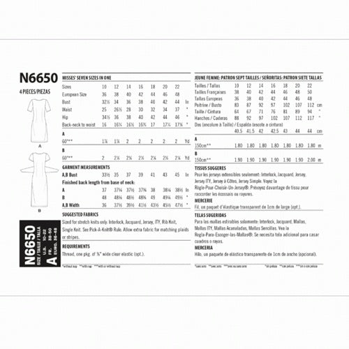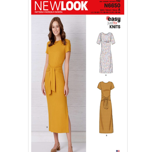 Ladies Dresses in two lengths, easy to sew and design for stretch knits. slim pull-on dress with optional waist-tie feature. Short sleeves in two length options. New Look Pattern.