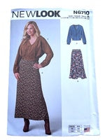 Ladies Jacket & Skirt. Zip front princess seamed hip length jacket has all-in-one sleeves gathered to wrist; the pull-on knit skirt is midi length. New Look sewing pattern.