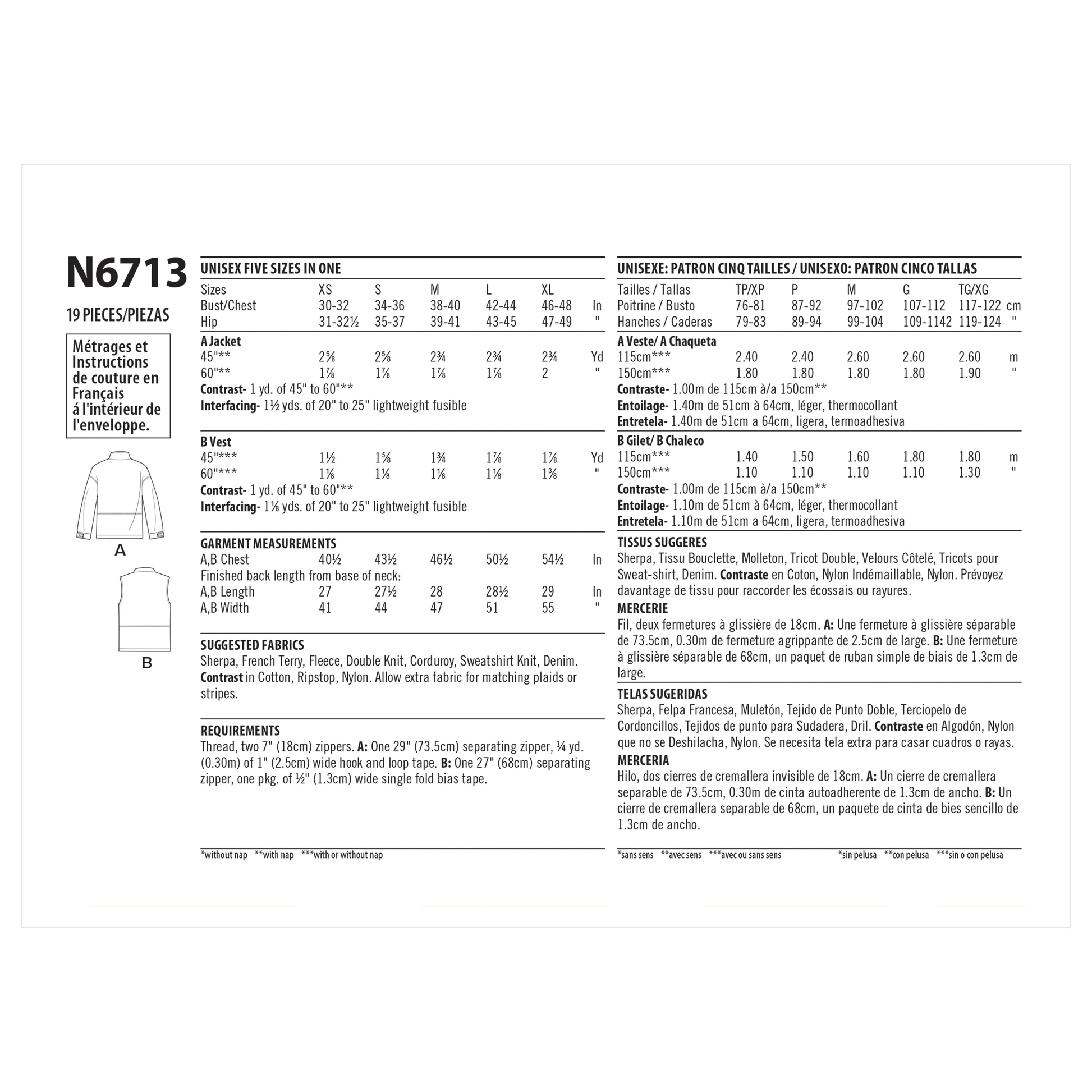 Unisex jacket, high neck & vest, stand neck; shoulder yoke & front zipper pocket. Vest collar, jacket sleeve band & pocket: contrast fabric. New Look Pattern.
