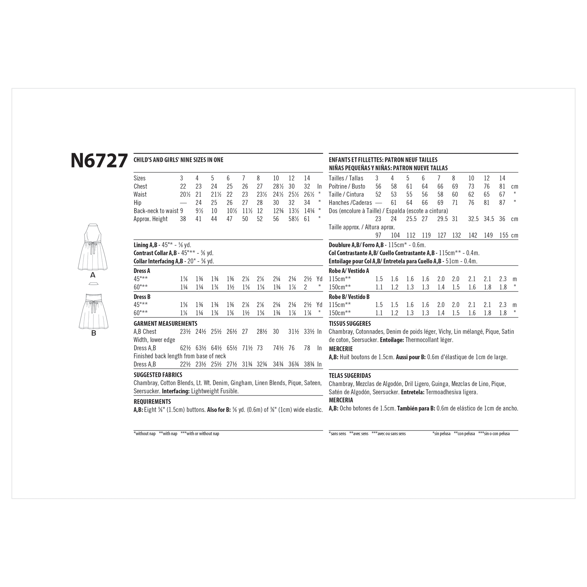 6727 - Children & Girls Dresses. Sundresses with lined bodices feature an open or full back option, contrast peter pan collar, front buttons & gathered skirt with back tie. New Look Pattern.