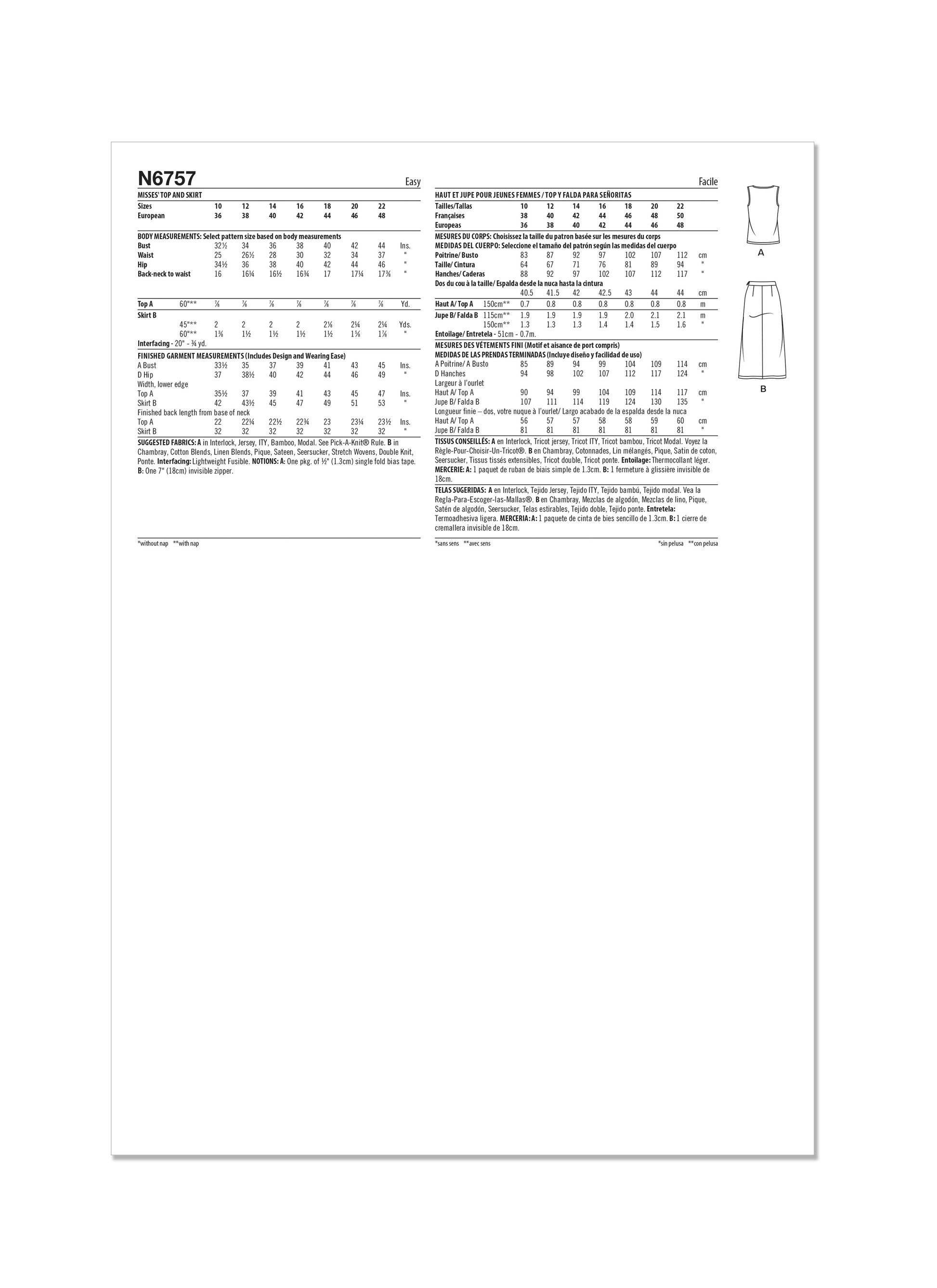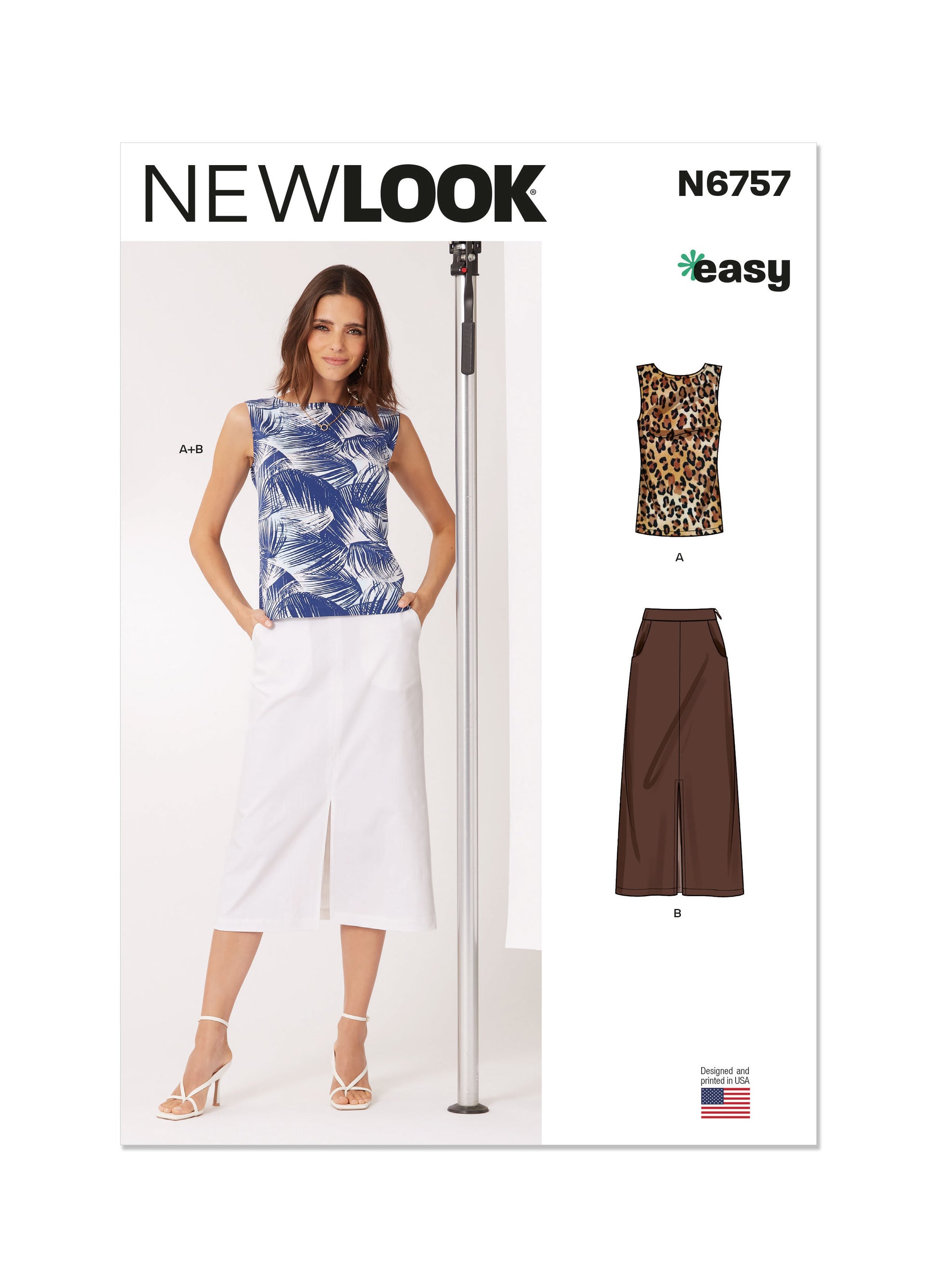 Ladies Casual Top & Pants. This easy-to-sew sleeveless knit top with bias tape finish pairs perfectly with the midi length skirt that has side front pockets, side invisible zipper and front slit. New Look Pattern.