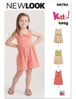 Children Girls Dress & Romper. Easy to sew. Easy to sew sleeveless dress with bow detail and zipper at back and romper with bow and zipper at front have self-lined bodice, raised waist, gathered skirt and narrow hem. View B has contrast bodice. New Look Pattern.